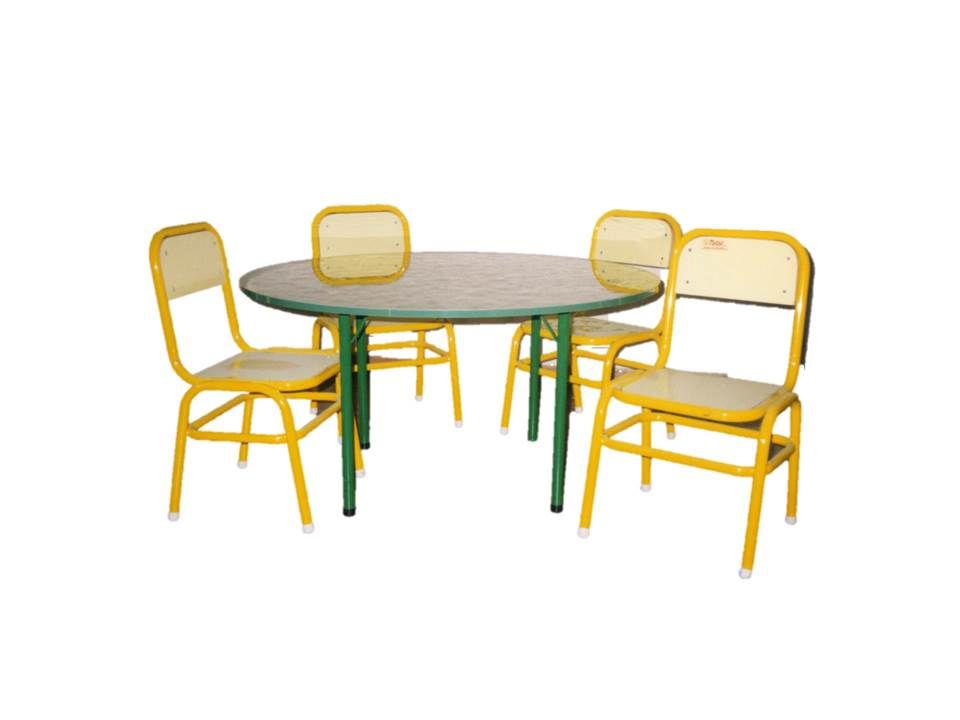 - Mesa infantil: la estructura está hecha de caño de 1″ y con una tapa de multilaminado de madera de forma circular, revestida con un laminado plástico. Puede ser con un diámetro de 100 cm o de 120 cm. Toda la estructura está recubierta de pintura epoxi y luego horneada.